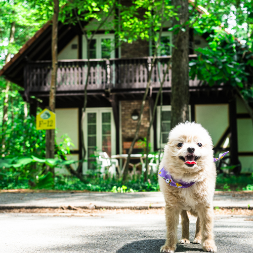 ワンちゃんと一緒に気兼ねなく貸し切りコテージ。広いフィールドをワンちゃんとご一緒におくつろぎください。